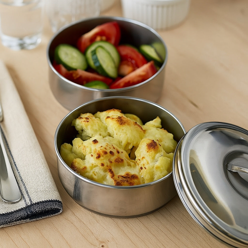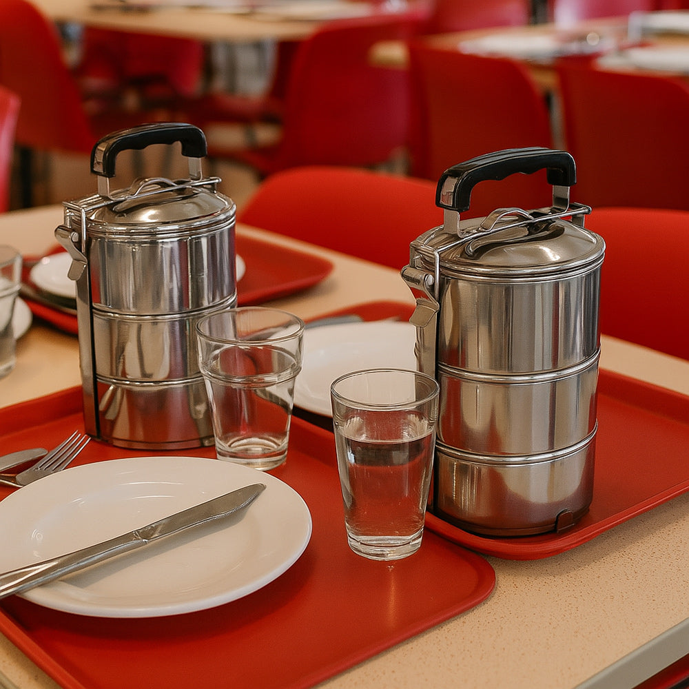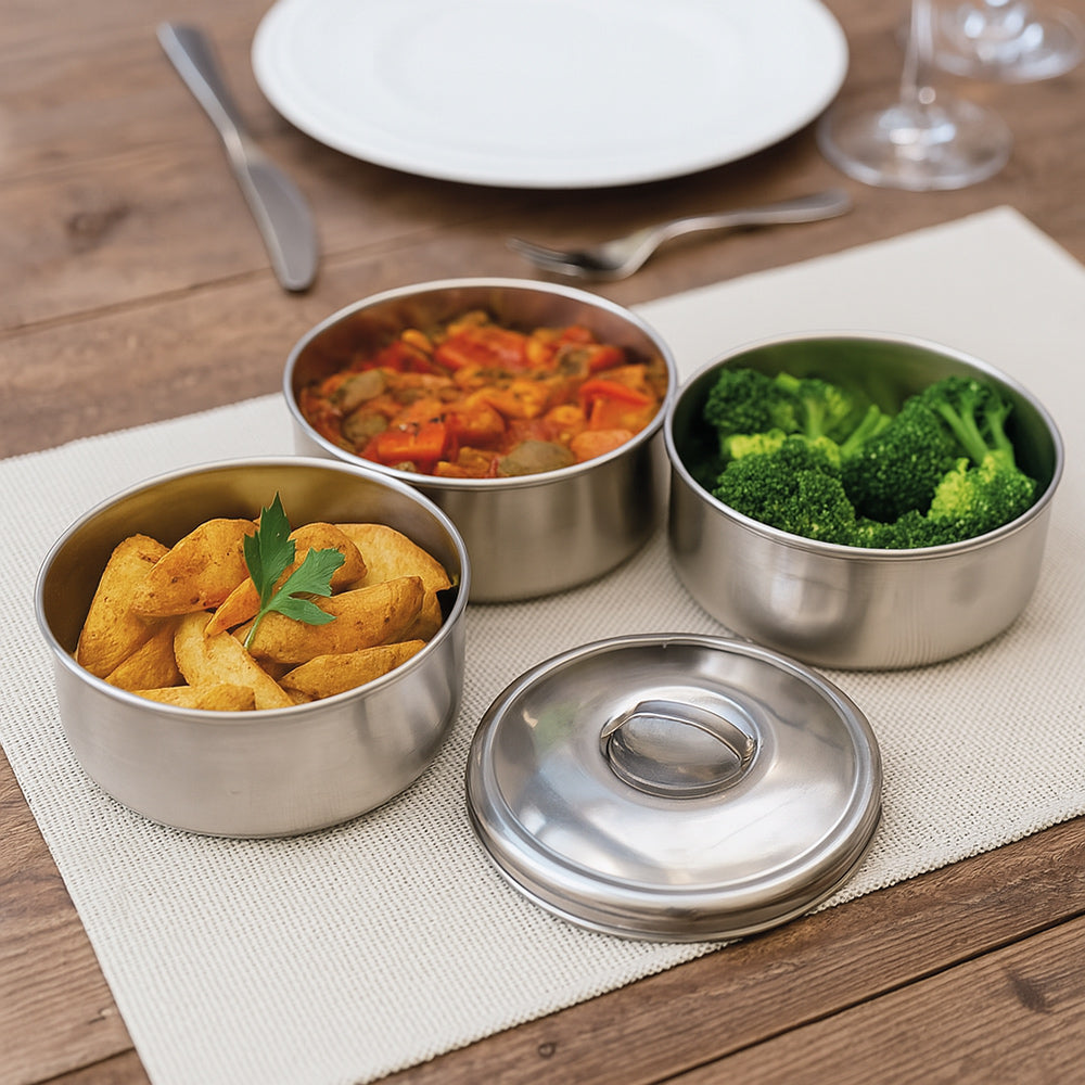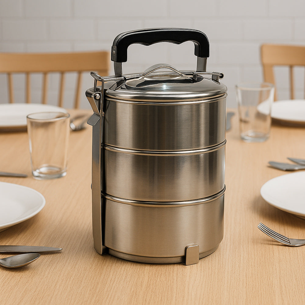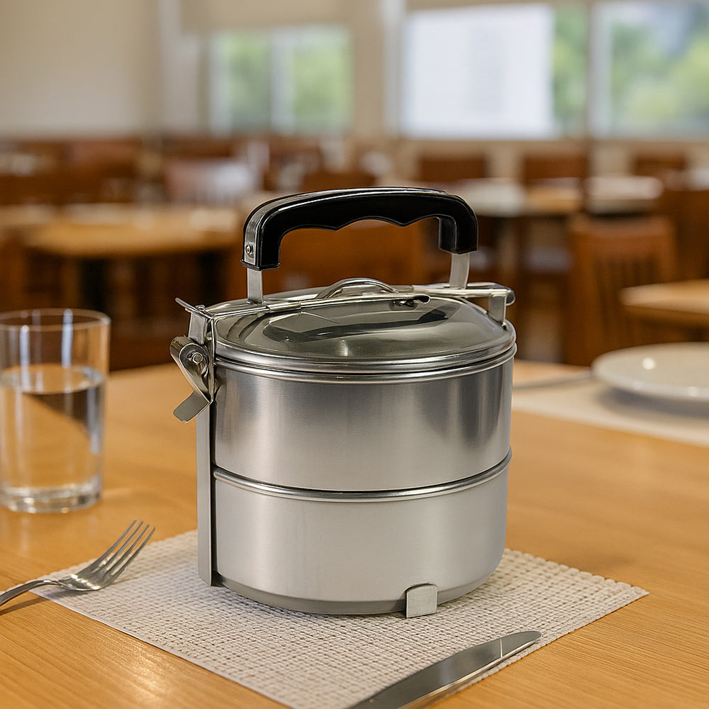 Il portavivande in acciaio è la soluzione ideale per trasportare il pranzo a lavoro. a scuola o in qualsiasi altra occasione. Grazie al pratico manico in acciaio può essere portato comodamente a mano ovunque. mentre i livelli separati mantengono le pietanze ben divise evitando di mischiare sapori e consistenze. I piani sono staccabili e combinabili in base alle esigenze. così da adattarsi perfettamente a ogni situazione. Il meccanismo di chiusura a clip garantisce una sigillatura sicura che impedisce fuoriuscite e cadute accidentali di cibo. Realizzato in acciaio resistente e igienico. è semplice da pulire e pensato per durare nel tempo. Permette inoltre di risparmiare denaro preparando i pasti a casa ed evitando pranzi costosi in mensa o al ristorante. È disponibile nella versione a 2 livelli con 2 ciotole da 12 cm di altezza e 14 cm di diametro ciascuna. oppure nella versione a 3 livelli con 3 ciotole da 17 cm di altezza e 14 cm di diametro ciascuna. Un accessorio pratico. funzionale ed elegante che unisce comodità e organizzazione per chi desidera portare con sé il gusto di casa in ogni momento della giornata.